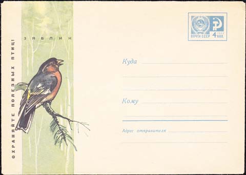 1967 г. Птица на ветке. Текст: "Охраняйте полезных птиц! Зяблик."