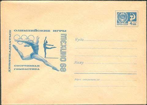 1968 г. Две гимнастки и олимпийская символика. Текст: "Двадцатые Олимпийские игры Мехико 68. Спортивная гимнастика".