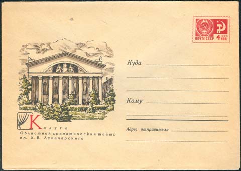 1969 г. Здание театра. Текст: "Калуга. Областной драматический театр им. А.В. Луначарского".