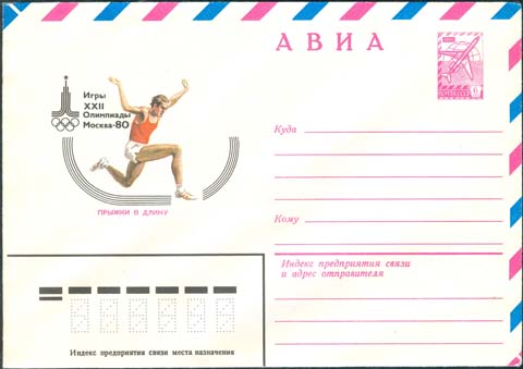 1979 г. Спортсмен, прыгающий в длину. Текст: "Игры XXII Олимпиады Москва - 80. Прыжки в длину".