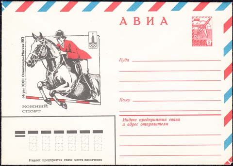 1979 г. Спортсмен на лошади и эмблема ОИ Москава-80. Текст: "Игры XXII Олимпиады Москва-80. Конный спорт".