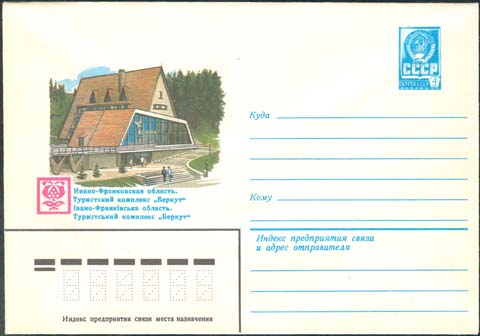 1980 г. Здание туристического комплекса. Текст на русском и украинском языках: "Ивано-Франковская область. Туристский комплекс "Беркут"".