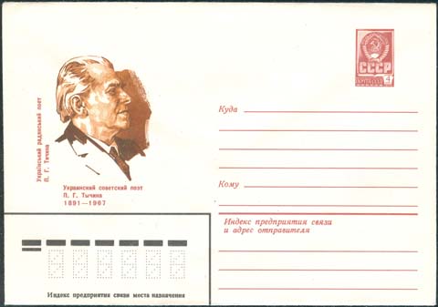 1980 г. Портрет П.Г. Тычины. Текст на русском и украинском языке: "Украинский советский поэт П.Г. Тычина 1891 - 1967".