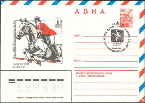 1979 г. Спортсмен на лошади и эмблема ОИ Москава-80. Текст: "Игры XXII Олимпиады Москва-80. Конный спорт".