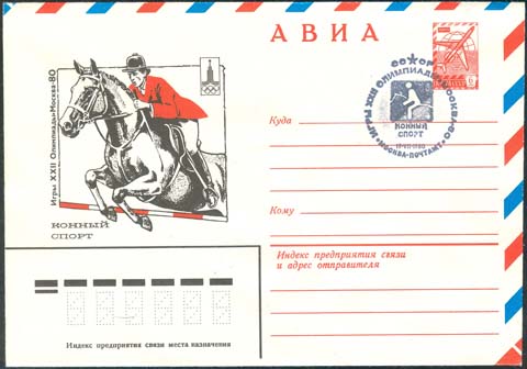 Примечание: Примечание(я): Примечание:\nСГ1. Спецштемпель с текстом:"Мгры XXII олимпиады Москва-80. Конный спорт. Москва почтамn 19.VII.1980". Цвета: Черный и темно-фиолетовый.