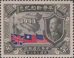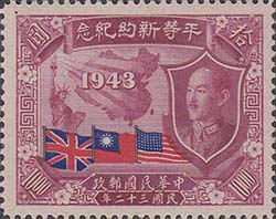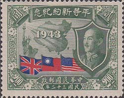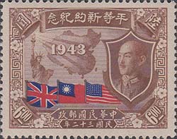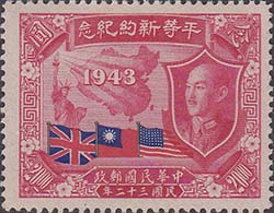 1945 г. 07.07.1945 г. Разм. рамки 38, 5 х 29 мм. Двухцветная и многоцветная металлография на белой бумаге. Зубц. 12. С клеем. В центре карта Китая и дата: "1943". Слева статуя Свободы. Справа портрет Чан Кайши. Внизу флаги Великобритании, США и Китая.