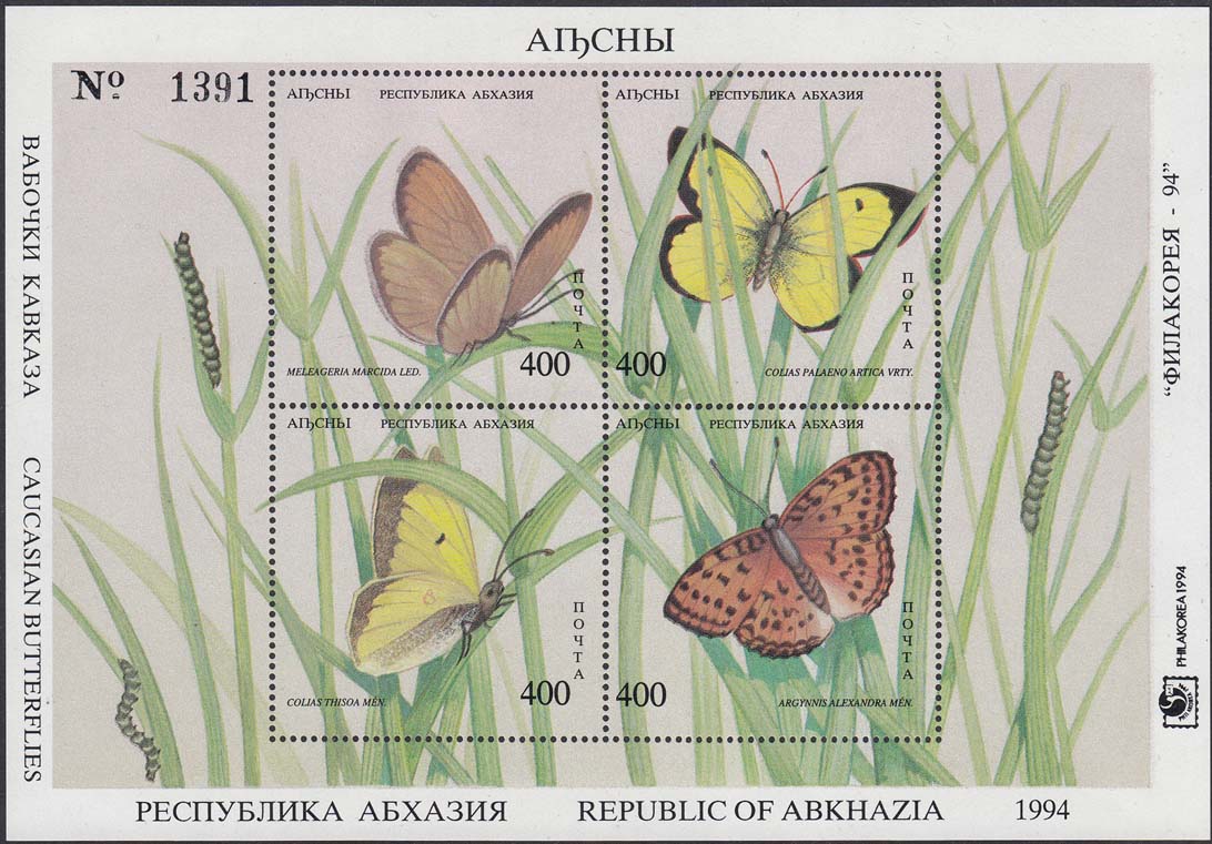 1994 г. 22.11.1994 г. Разм. по перфорации 51 х 51 мм. Многоцветная печать на белой глянцевой бумаге. Зубц. рам. 12 3/4. С клеем. В центре бабочки различных видов с подписями на латыни. По периметру название страны и номинал.