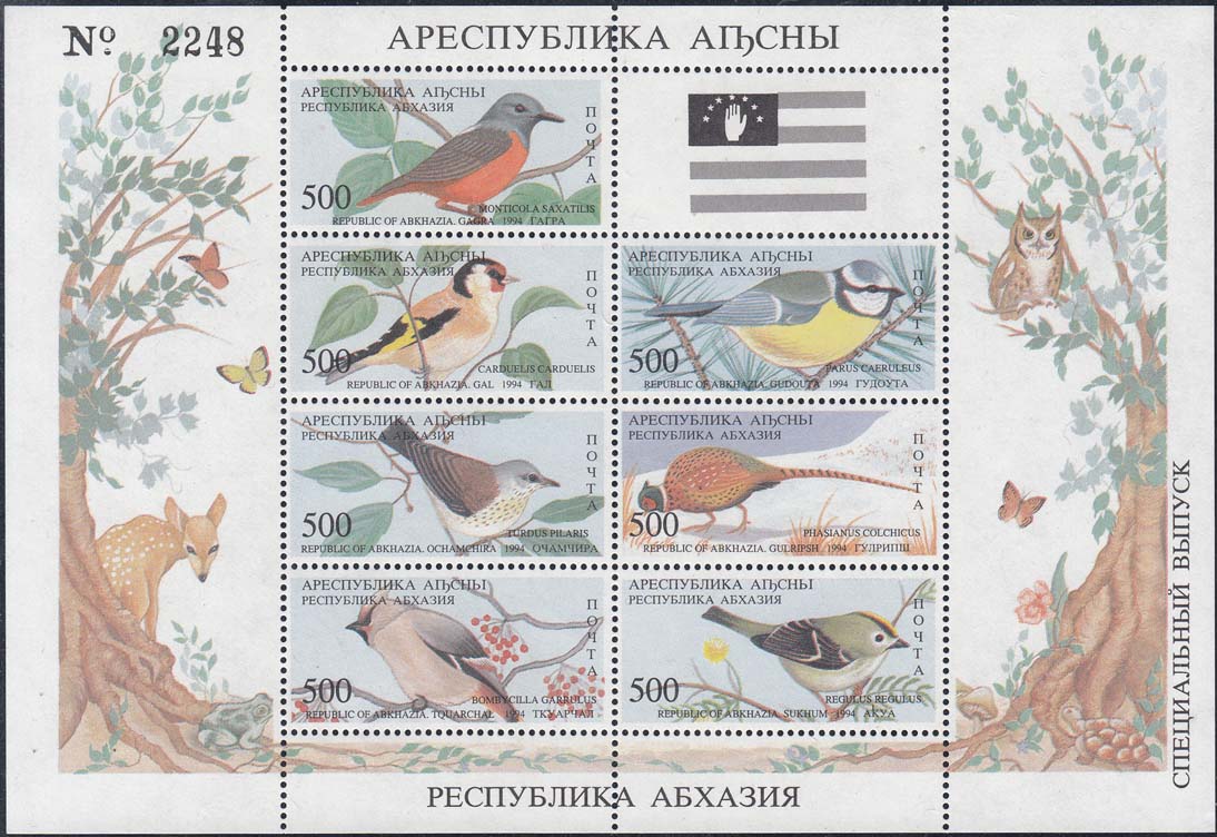 1994 г. Октябрь Разм. по перфорации 48 х 22 мм. Многоцветная печать на белой глянцевой бумаге. Зубц. рам. 12 1/2. С клеем. В центре птицы различных видов с подписями на латыни. По периметру название страны и номинал.