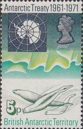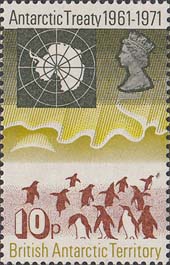 1971 г. 23.07.1971 Разм. по перфорации 28 х 44 мм. Многоцветная печать на белой бумаге с ВЗ 1. Зубц. рам. 14 1/2 х 13 1/2. С клеем. Сверху карта Антарктиды, внизу различные сюжеты. Номинал и тексты на английском языке.