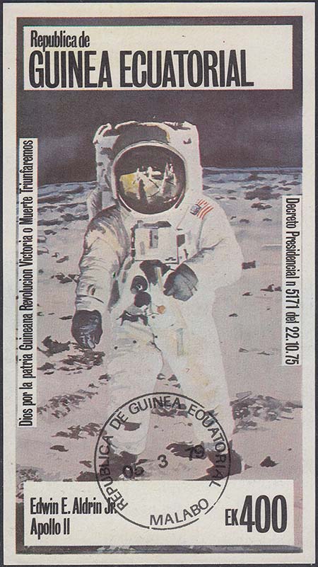 1979 г. Разм. 75 х 135 мм. Многоцветная печать на белой бумаге. В центре американский астронавт в скафандре на поверхности Луны. Тексты на испанском языке.