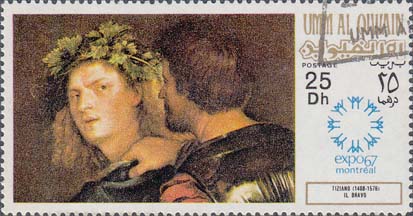 1967 г. 31 октября. Разм. рис. 48 х 32 мм. Многоцветная печать на белой бумаге. Зубц. 13 1/2 и Б.З. С клеем. Слева репродукции различных картин. Справа сверху название страны и номинал на английском и арабском языках. Справа в центре логотип выставки EXPO 67 в Монреале. Справа внизу в прямоугольной рамке пояснительный текст к картине на английском языке.