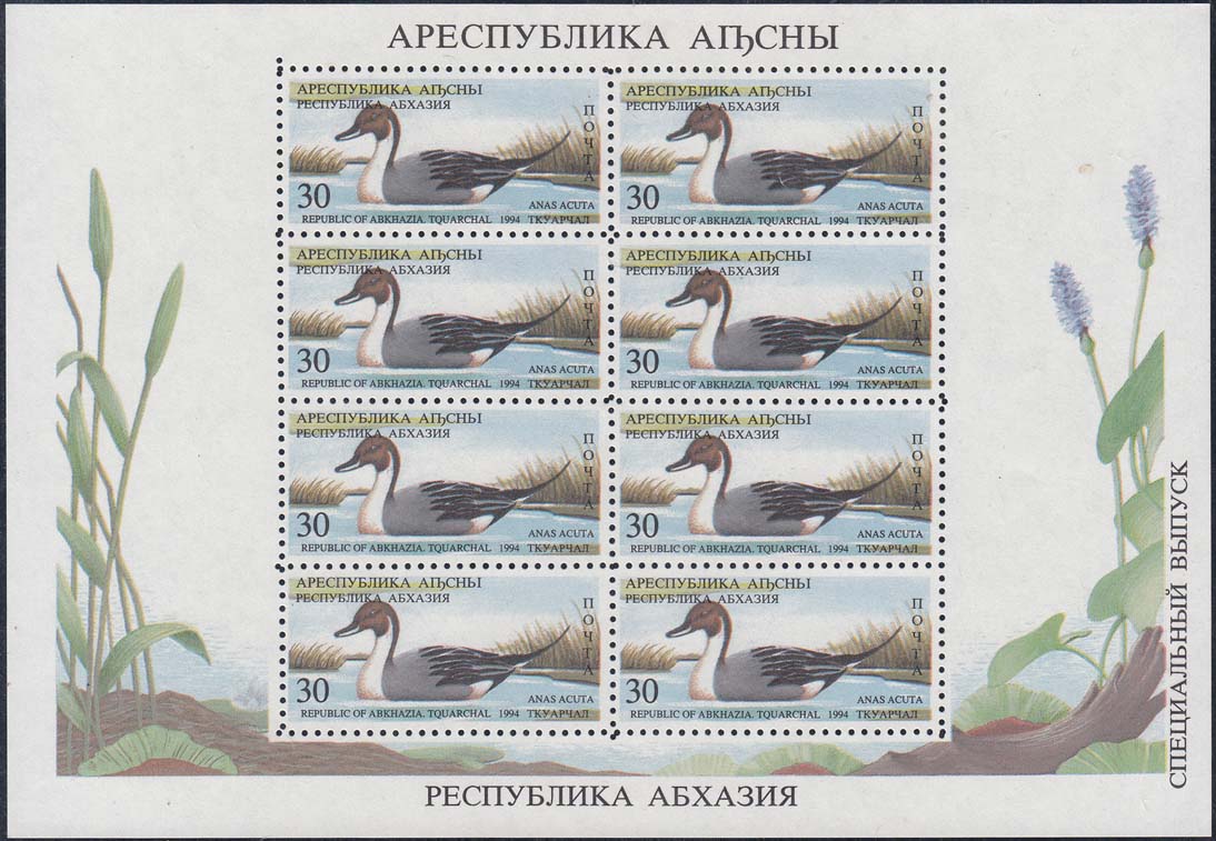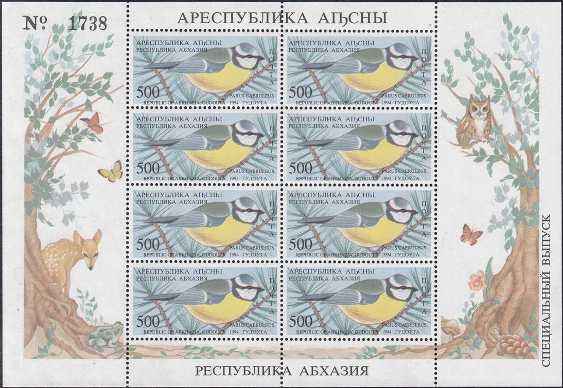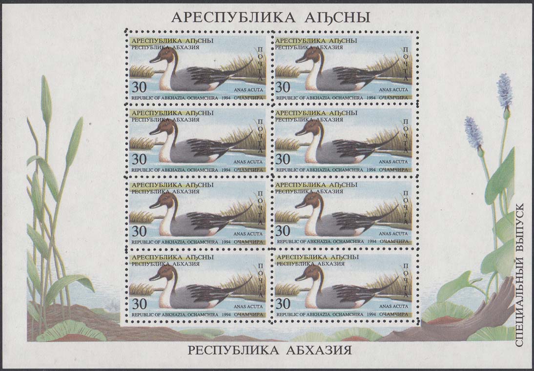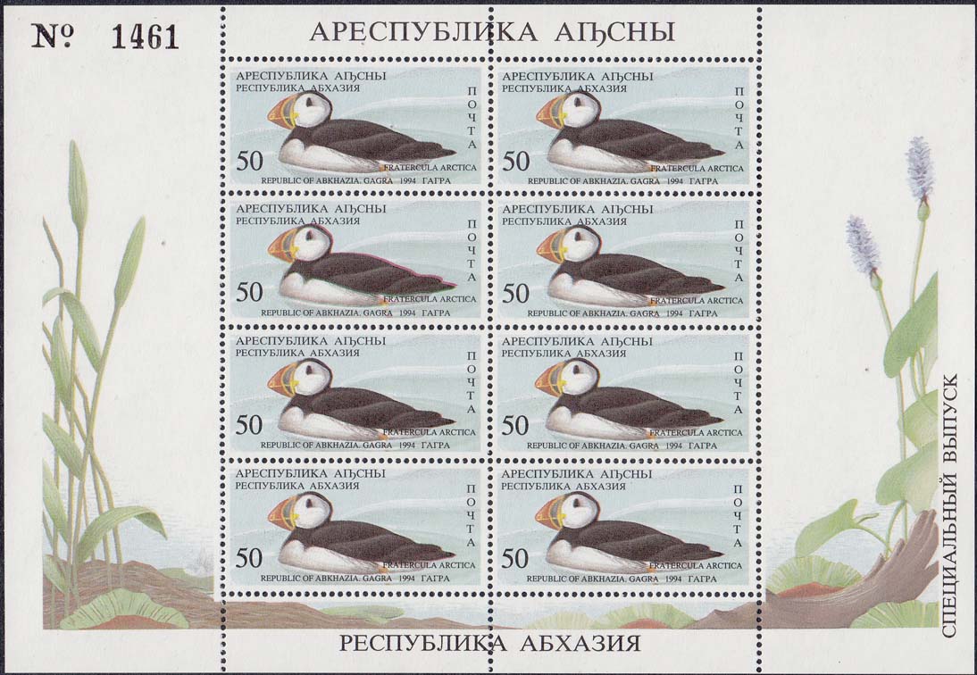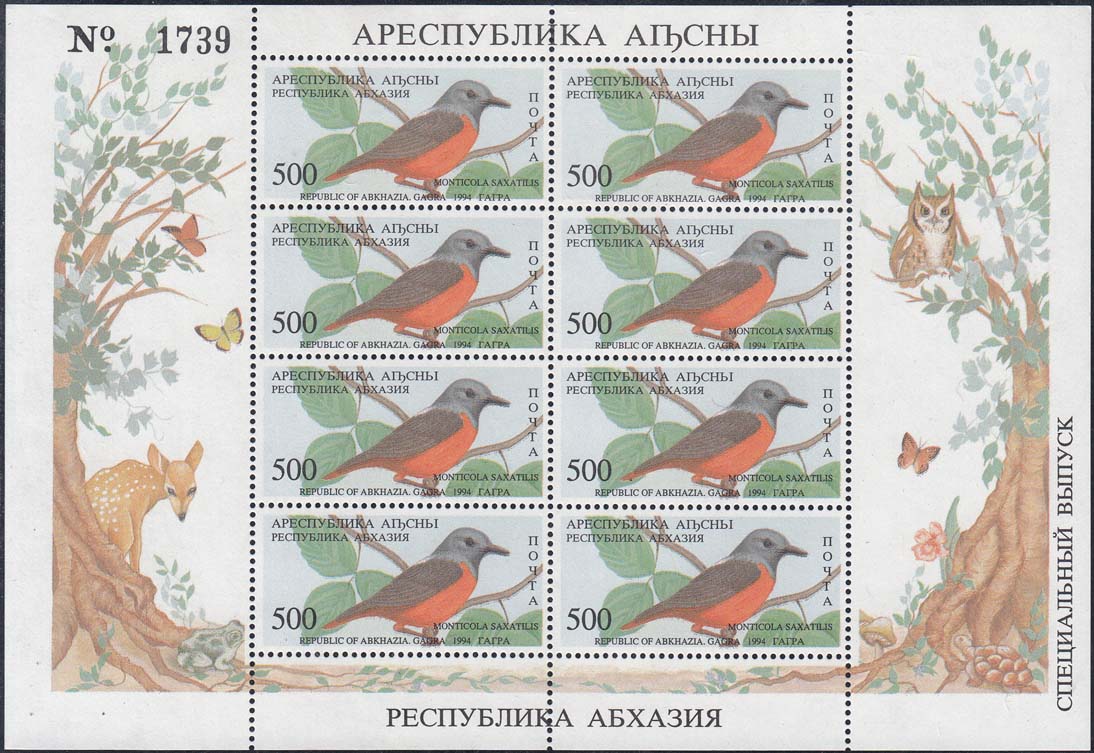 1994 г. 31.05. - октябрь. Разм. рис. 48 х 22 мм. Многоцветная печать на белой бумаге. Зубц. Лин. 10. С клеем. В центре птицы различных видов. По периметру номинал и тексты на абхазском языке.