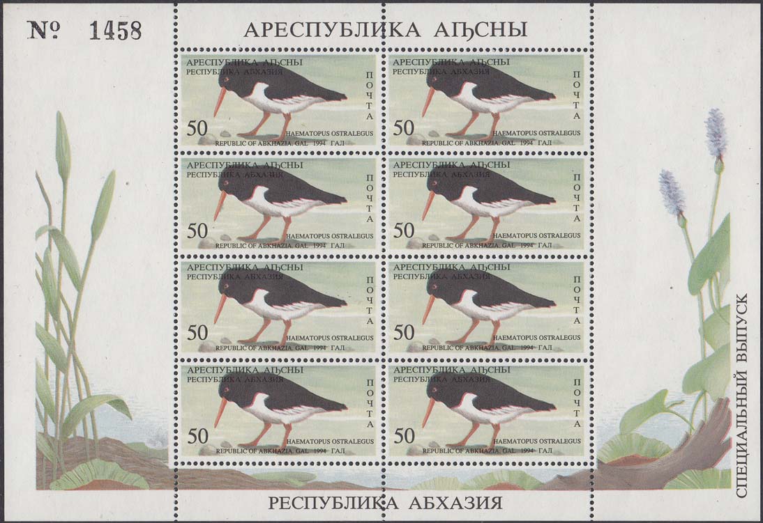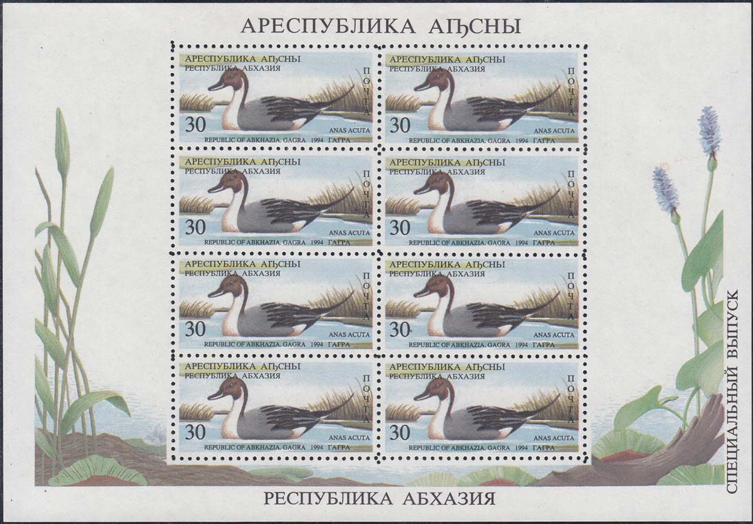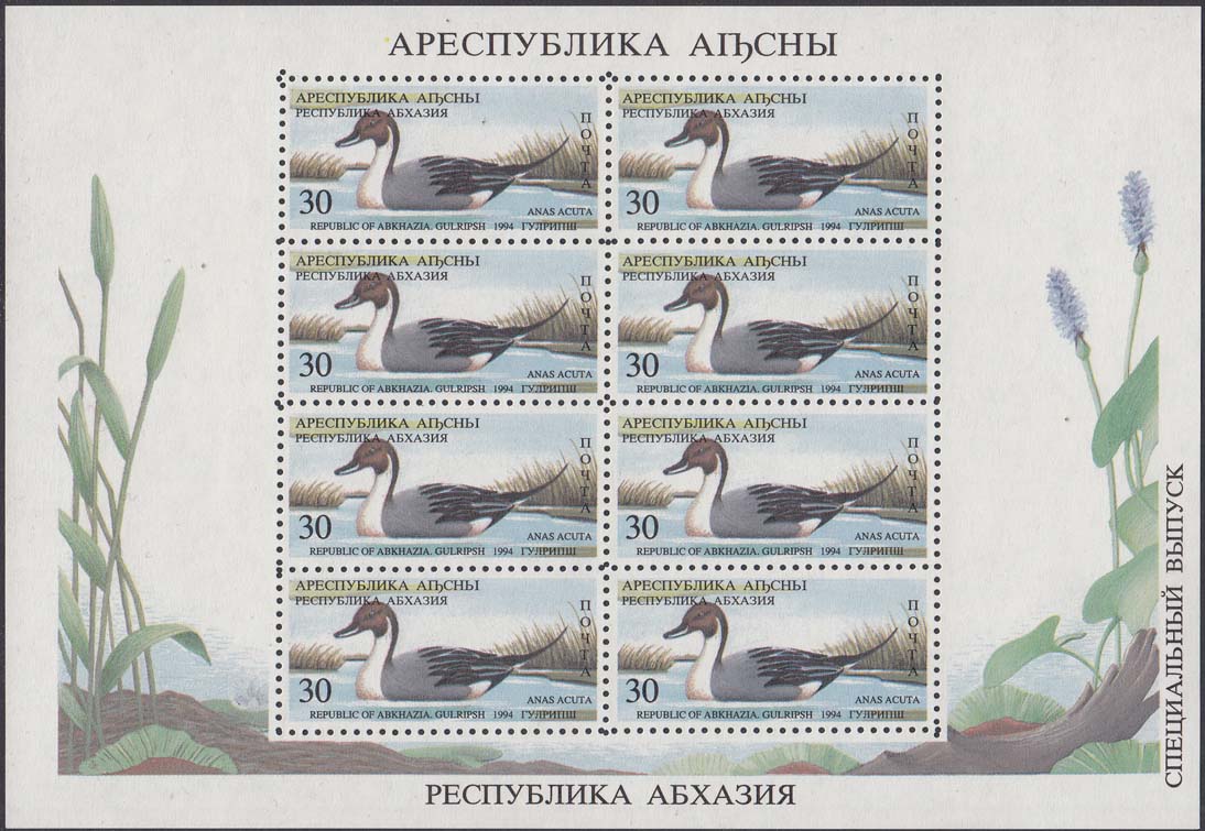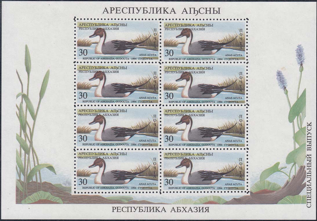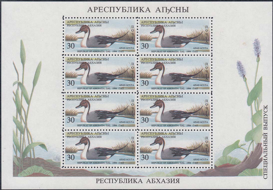1994 г. 31.05. - октябрь. Разм. рис. 48 х 22 мм. Многоцветная печать на белой бумаге. Зубц. Лин. 10. С клеем. В центре птицы различных видов. По периметру номинал и тексты на абхазском языке.