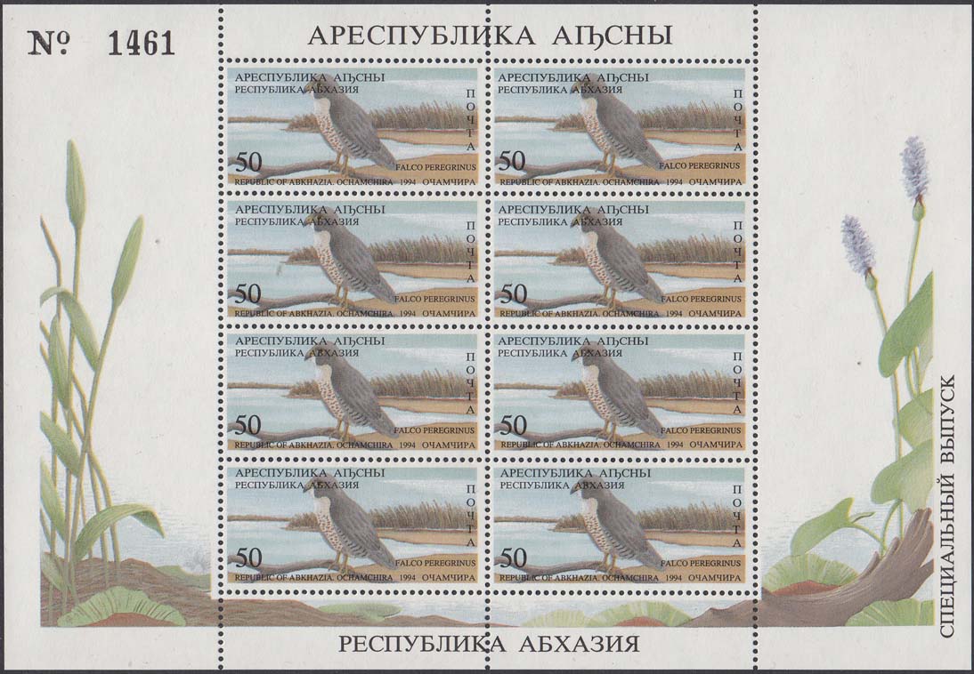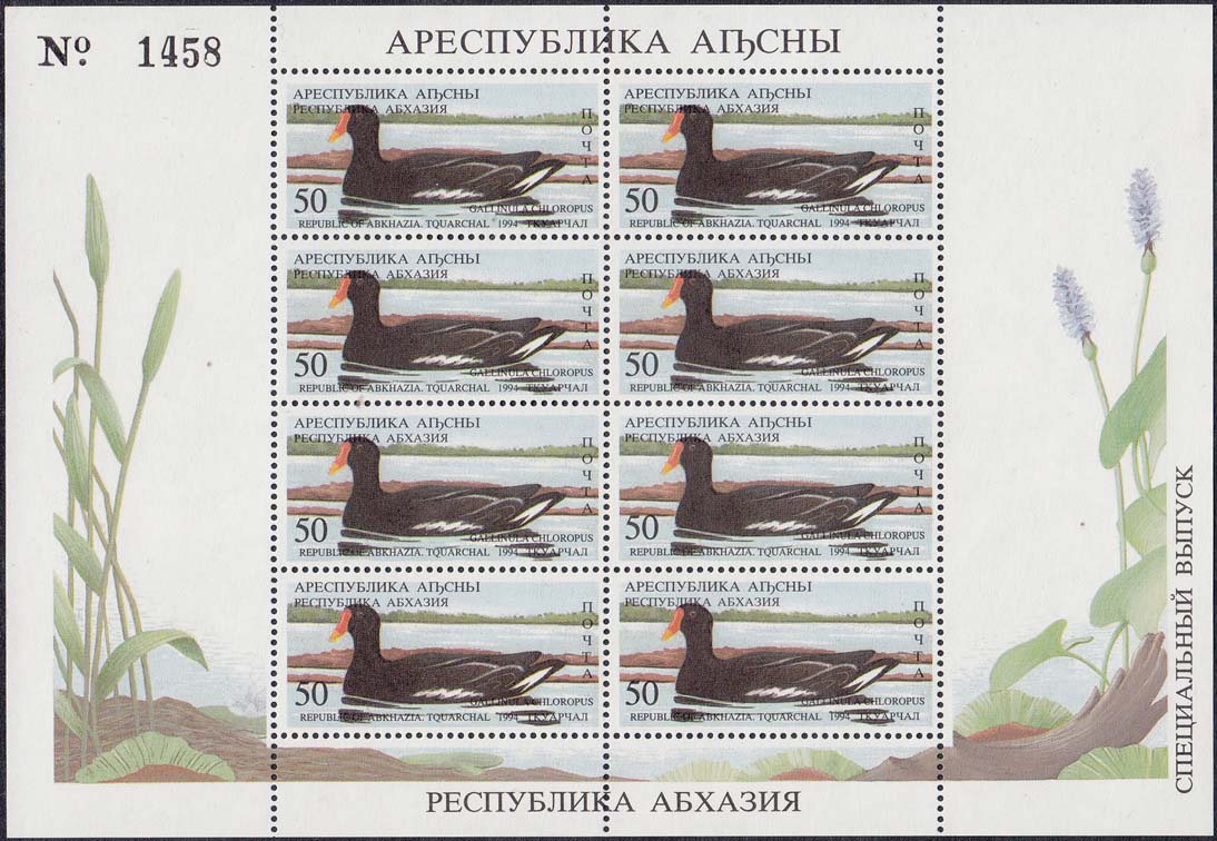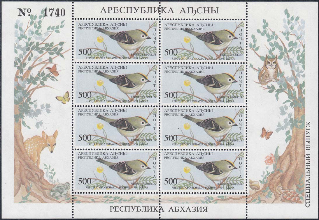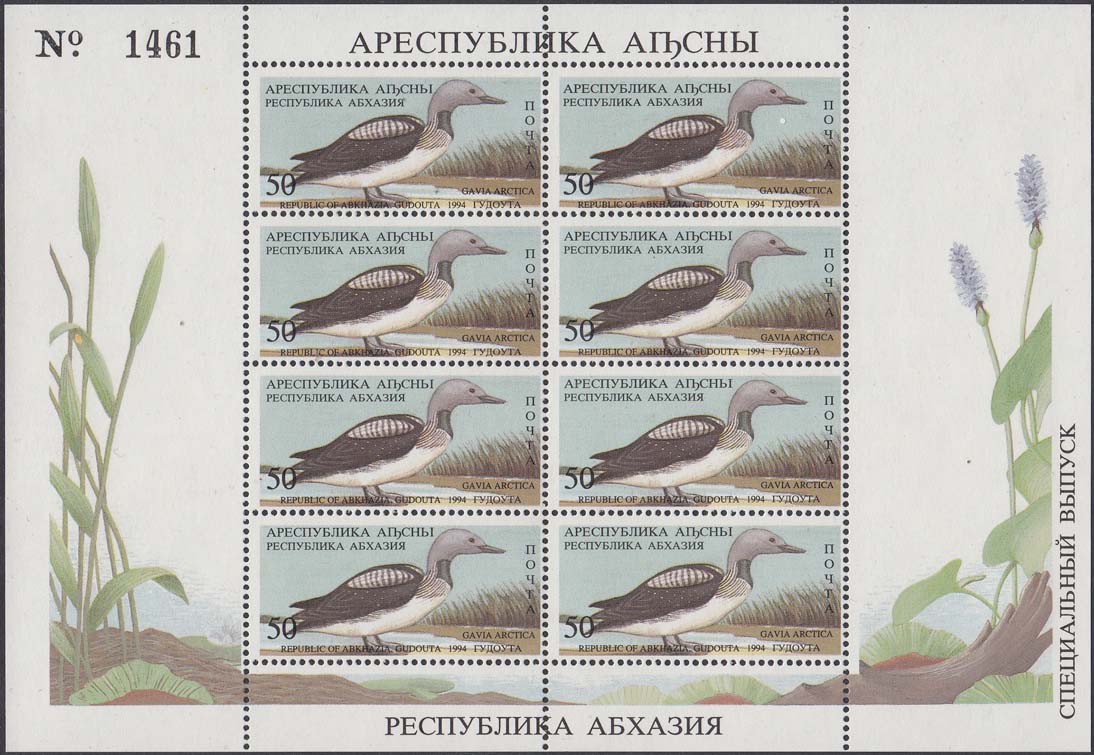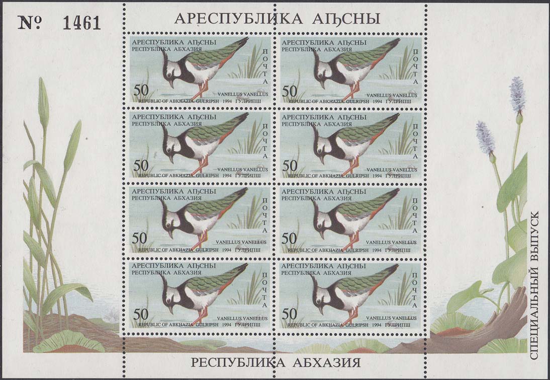 1994 г. 31.05. - октябрь. Разм. рис. 48 х 22 мм. Многоцветная печать на белой бумаге. Зубц. Лин. 10. С клеем. В центре птицы различных видов. По периметру номинал и тексты на абхазском языке.