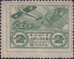 1923 г. Третий всесоюзный выпуск. Разм. рамки 36 х 27 мм. Одноцветная печать на тонкой сероватой бумаге. Зубц. 11 1/2. С клеем. Рис. второго выпуска, но воздушный шар наклонен вправо, а облака и лучи солнца заштрихованы, при этом левый верхний угол марки оставлен белым.