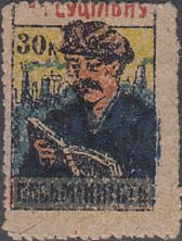 1932 г. Разм. рамки 22,5 х 33,5 мм. Многоцветная печать на белой бумаге низкого качества. Нерегулярная зубц. В центре в прямоугольной рамке рабочий с открытой книгой на фоне индустриального пейзажа. В левом верхнем углу номинал. Сверху текст на украинском языке: «За сплошную». Внизу продолжение текста: «Грамотность».