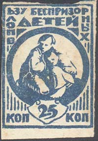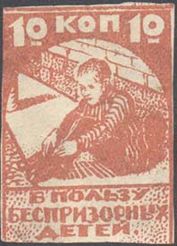1925 г. Разм. рамки 32 х 43 мм. Одноцветная печать на белой бумаге. В прямоугольной рамке в центре в круге двое беспризорных детей. Сверху текст в две строки: «В пользу беспризорных детей». Внизу номинал.