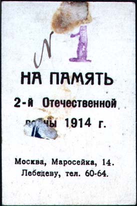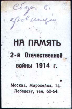 1915 г. 10.-13.03.1915 г. Виньетки с портретами глав стран-союзниц России в Первой мировой войне. Разм. ≈ 45 х 69 мм. Двухцветная двухсторонняя печать на плотной белой бумаге. На лицевой стороне в декоративных рамках овальные репродукции фотографий глав государств. Внизу в прямоугольной рамке подпись к портрету. На оборотной стороне текст в три строки крупным шрифтом: «На память 2-й Отечественной войны 1914 г.». Внизу мелким шрифтом текст в две строки: «Москва, Маросейка, 14. Лебедеву, тел. 60-64.».
