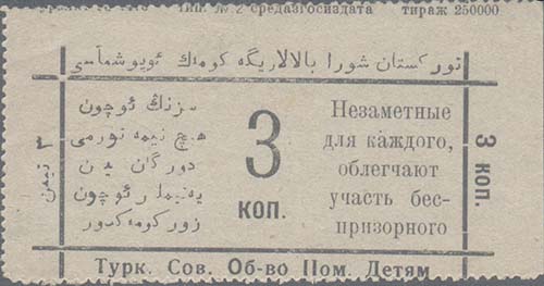 1924(?) г.   Разм. рамки 64 х 27 мм. Одноцветная печать на бумаге различных цветов. В рамке номинал текст на русском и узбекском, арабским шрифтом языках: «...коп. Незаметные для каждого, об-легчают участь беспризорного». Внизу под рамкой текст: «Турк[естанское]. Сов[етское]. Об-во Пом[ощи]. Детям». Внизу мелким шрифтом выходные данные.