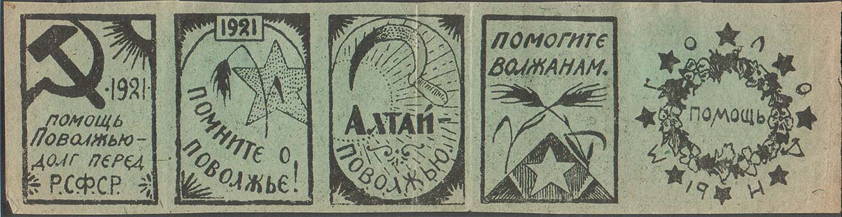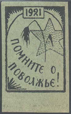 | Разм. рамки 33 х 47 мм. В прямоугольной рамке сверху дата: «1921». Ниже пятиконечная звезда и колос пшеницы. Ниже текст в две строки полукругом: «Помните о Поволжье!». | |||||||