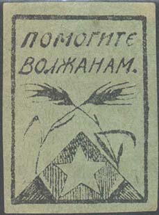 | Разм. рамки 33 х 47 мм. В прямоугольной рамке сверху текст в две строки: «Помогите волжанам». Внизу пятиконечная звезда в треугольной рамке и два колоса пшеницы. | |||||||