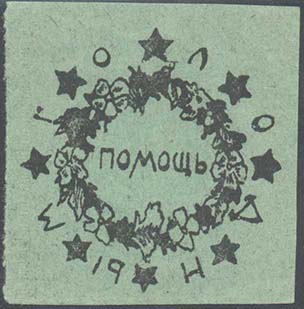 | Разм. 50 х 50 мм. В центре в круглой декоративной рамке в виде венка цветов текст: «Помощь». По окружности рамки текст: «Голодным». Между буквами текста пятиконечные звезды. | |||||||