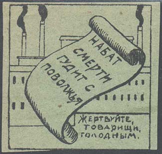 | Разм. рамки 87 х 48 мм. В прямоугольной рамке на фоне завода картуш с текстом в четыре строки: «Набат смерти гудит с Поволжья». В правом нижнем углу текст в три строки: «Жертвуйте, товарищи, голодным». | |||||||