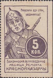 1923 г.   Разм. рамки 29 х 44 мм. Одноцветная печать на белой бумаге. Зубц. 11 1/2. В прямоугольной рамке красноармеец с винтовкой за плечами. Справа в двойной круглой рамке номинал. В правом верхнем углу текст в две строки: «Пролетарии всех стран, соединяйтесь!». Внизу текст в три строки: «Губкомиссия по проведению месяца ремонта Красной Казармы».