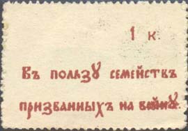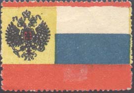 1915 г. Разм. 45 х 30 мм. Многоцветная двухсторонняя печать на белой бумаге. Зубц. 11 1/2. На лицевой стороне новый государственный флаг России. На оборотной стороне номинал, ниже текст в две строки: «В пользу семейств призванных на войну».