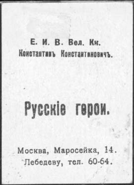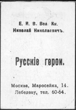 1914 г. 1915(?) г. Разм. рамки 40 х 56 мм. Двухцветная двухсторонняя печать на плотной белой бумаге. На лицевой стороне в двойной прямоугольной декоративной рамке портреты героев войны. На оборотной стороне звания и фамилии героев и текст: «Русские герои. Москва, Маросейка, 14. Лебедеву, тел. 60-64. ».