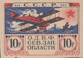 | Разм. рамки 55 х 30 мм. В центре самолет-биплан, снижающийся слева направо. По бокам пропеллеры в обрамлении венков. Сверху аббревиатура «С.С.С.Р.». Внизу текст в две строки: «О.Д.В.Ф. Сев[еро].-Зап[адной]. области». В нижних углах в прямоугольных рамках номинал. | |||||