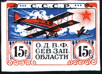 | Разм. рамки 49 х 33 мм. В рамке в центре два самолета-биплана на фоне облаков и пятиконечная звезда с лучами. Сверху аббревиатура «С.С.С.Р.». Внизу текст в три строки: «О.Д.В.Ф. Сев[еро]. Зап[адной]. области». В нижних углах в круглых рамках номинал. | |||||
