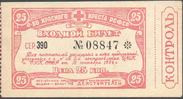 1924 г. Разм. 100 х 53 мм. Двухцветная печать на желтоватой бумаге. Слева односторонняя зубцовка. В рамке по углам номинал. Текст: «Общество Красного Креста РСФСР Входной билет Сер[ия]. ... №... Для посетителей зрелищных и иных мероприятий, указанных в пункте «е» ст. 2-й постановления ЦИК и СНК СССР, от 12 сентября 1924 г. Цена ... коп. Без штампа предприятия с указанием даты выдачи билета - билет не действителен.». Справа контрольный талон. Слева корешок, на котором текст, аналогичный тексту на квитанции.