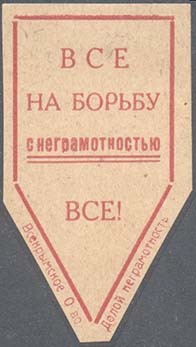 1929 г. 15.10.1929 г. Разм. 36 х 63 мм. Одноцветная печать на толстой желтоватой бумаге. В пятиугольной рамке разм. 27 х 53 мм сверху текст в три строки: «Все на борьбу с неграмотностью. Ниже текст: «Все!». Внизу по наружному периметру рамки текст: «Всекрымское О-во Долой неграмотность».