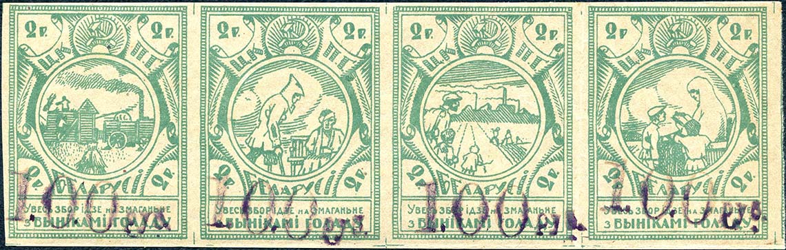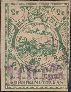 1923 г. Фиолетовая (оттенки) надпечатка нового номинала в виде текста: «100 руб.» на марках предыдущего выпуска.