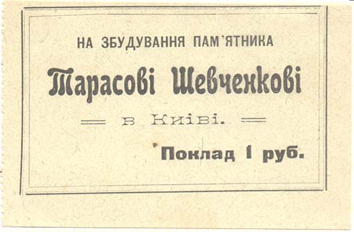 1906(?) г. Листок из квитанционной книжки разм. 83 х 61 мм. Одноцветная печать на бумаге различных цветов. Левосторонняя зубц. 11 1/2. В тройной прямоугольной рамке текст на украинском языке в четыре строки: «На создание памятника Тарасу Шевченко в Киеве. Взнос ... копеек».