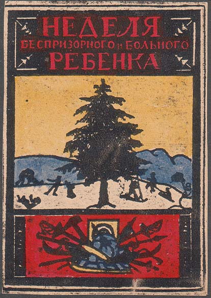 1925(?) г. Листок разм. 73 х 99 мм. Одноцветная печать на бумаге различных цветов. В центре в прямоугольной рамке разм. 66 х 94 мм елка, горки и играющие дети. Сверху текст в три строки: «Неделя беспризорного и больного ребенка». Внизу разнообразный спортивный инвентарь.
