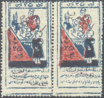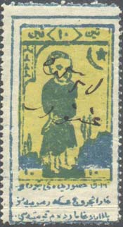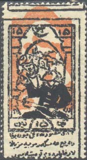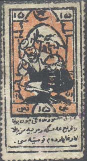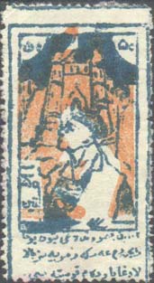 1925 г. Двухцветная печать низкого качества на белой бумаге. Зубц. 11 1/2. С клеем. В центре в прямоугольной декоративной рамке различные сюжеты. Внизу текст в три строки на местном языке арабским шрифтом.