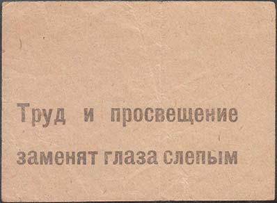 1927 г. 17.09.1927 г. Разм. 66 х 45 мм. Одноцветная печать на желтоватой бумаге. В центре текст в две строки: «Труд и просвещение заменят глаза слепым».