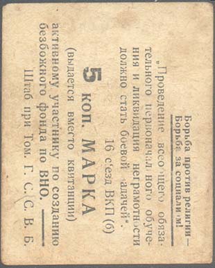 1930 г. 1930 г. Разм. 51 х 63 мм. Одноцветная двухсторонняя печать на бумаге различных цветов. На лицевой стороне в центре текст в две строки: «С.В.Б. Томский Городской Совет». Сверху текст в три строки: «На началах строгой добровольности». Внизу перевернутый текст в четыре строки: «Собранные средства идут на организацию горячих завтраков в школах для детей беднейшего населения». На оборотной стороне снизу вверх текст в двенадцать строк: «Борьба против религии – Борьба за социализм! «Проведение всеобщего обязательного первоначального обучения и ликвидация неграмотности должно стать боевой задачей» 16 съезд ВКП(б) ... коп. Марка (выдается вместо квитанции) активному участнику по созданию безбожного фонда по ВНО. Штаб при Том. Г.С.С.В.Б.».