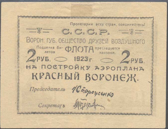 1923 г. Областной выпуск. Одноцветная двухсторонняя печать на желтоватой бумаге. На лицевой стороне в рамке разм. 95 х 63 мм из точек и линий три самолета-биплана, летящих над заводскими зданиями. Справа текст в пять строк: «Рабочий и крестьянин, седлай стального воздушного коня». На оборотной стороне в рамке разм. 92 х 66 мм из волнистых линий текст в десять строк: «Пролетарии всех стран, соединяйтесь! С.С.С.Р. Ворон[ежское]. Губ[ернское]. Общество друзей Воздушного Флота. Подделка билетов преследуется законом. 1923. На постройку аэроплана «Красный Воронеж». Председатель ... Секретарь ...».