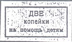 1925(?) г.   Разм. рамки 23 х 40 мм. Одноцветная печать на белой бумаге. В прямоугольной рамке в центре текст в три строки: «... (номинал текстом) на помощь детям».