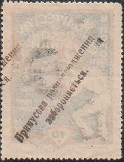 | Ручная черная надпечатка текста на украинском языке в две строки по диагонали: «Принудительное распространение запрещается» на оборотной стороне марки предыдущего выпуска. | |||||