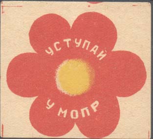 1930(?) г. 47 х 50 мм. Двухцветная печать на желтоватой бумаге. В центре цветок c различным количеством лепестков. Текст на белорусском языке в две строки: «Вступай в МОПР». По углам знака разграничительные линии.
