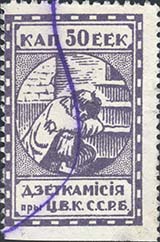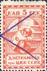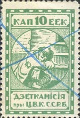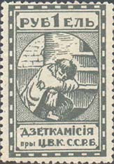 1924 г. Первый республиканский выпуск. Разм. рамки 23 х 36,5 мм. Одноцветная печать на белой (оттенки) бумаге. Зубц. 11 1/2. С клеем. В центре беспризорный ребенок, сидящий на ступенях. Сверху номинал, внизу текст в две строки на белорусском языке: «Деткомиссия при Ц.И.К. С.С.Р.Б.».