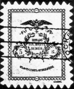 1914 г. Разм. 32 х 39 мм. Одноцветная печать на белой бумаге. Зубц. 11 1/2 и Б.З. Сверху орел с георгиевским крестом, ниже венок, в центре которого текст в три строки: «Воинам передовых позиций». Ниже полукругом текст: «От Общества Русских Антиквариев». Номинал в боковых гирляндах венка. Тип I – высота цифр номинала 2,5 мм. Тип II – высота цифр номинала 2 мм.
