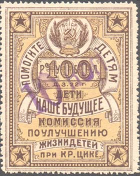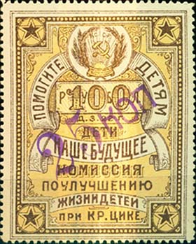 1924 г.  Четвертый вспомогательный выпуск. Синяя надпечатка нового номинала в золотой валюте крупным шрифтом в виде текста «5 к. червонных» на оборотной стороне марок первого выпуска. (О).