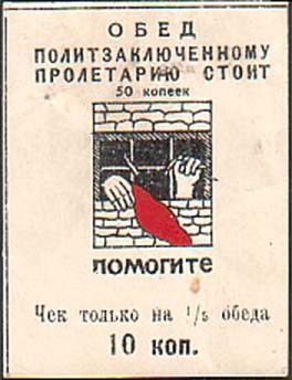 1929 г. Разм. 44 х 58 мм. Двухцветная печать на белой бумаге. В центре в прямоугольной рамке эмблема МОПР. Сверху текст в четыре строки: «Обед политзаключенному пролетарию стоит 50 копеек». Платок без штриховки.