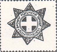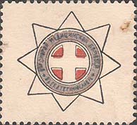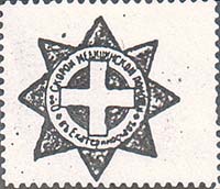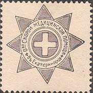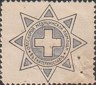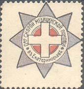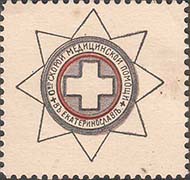 1910(?) г. Разм. по перфорации 32 х 32 мм. Зубц. 11 1/2. Двухцветная и трехцветная печать на белой бумаге. В центре восьмиугольник, в центре которого к двойной круглой рамке изображение красного креста. По окружности между рамками текст: «О-во скорой медицинской помощи в Екатериноставе».
