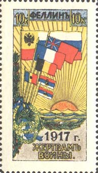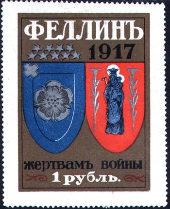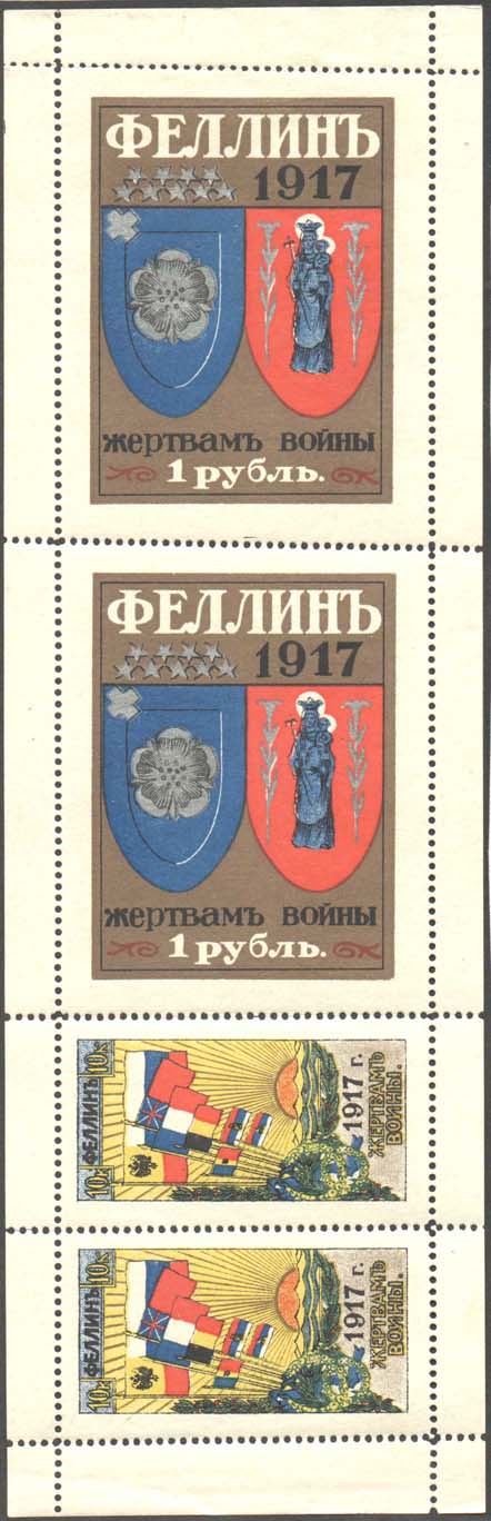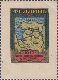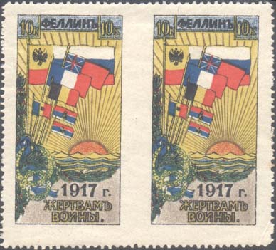 1917 г. Многоцветная печать на бумаге различных цветов. Зубц. 11 1/2. С клеем. В прямоугольной рамке в центре различные сюжеты. Текст: «Феллин - жертвам войны 1917».